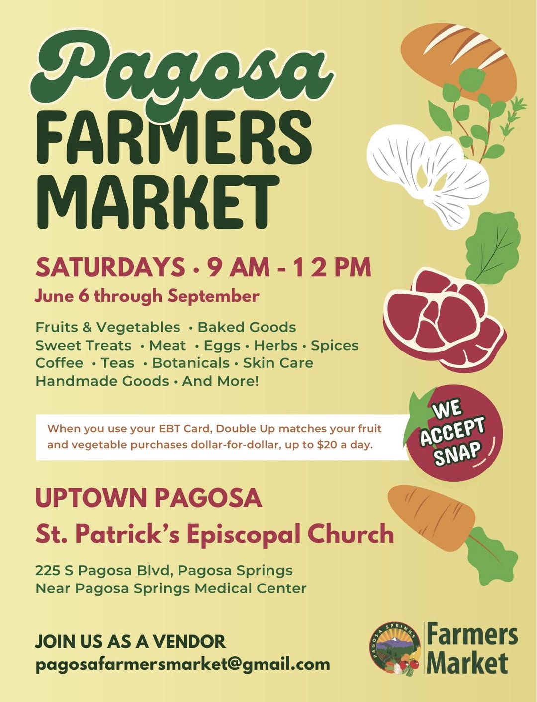 sat06jun9:00 am1:00 pmPagosa Farmer’s MarketSt. Patrick’s Episcopal Church