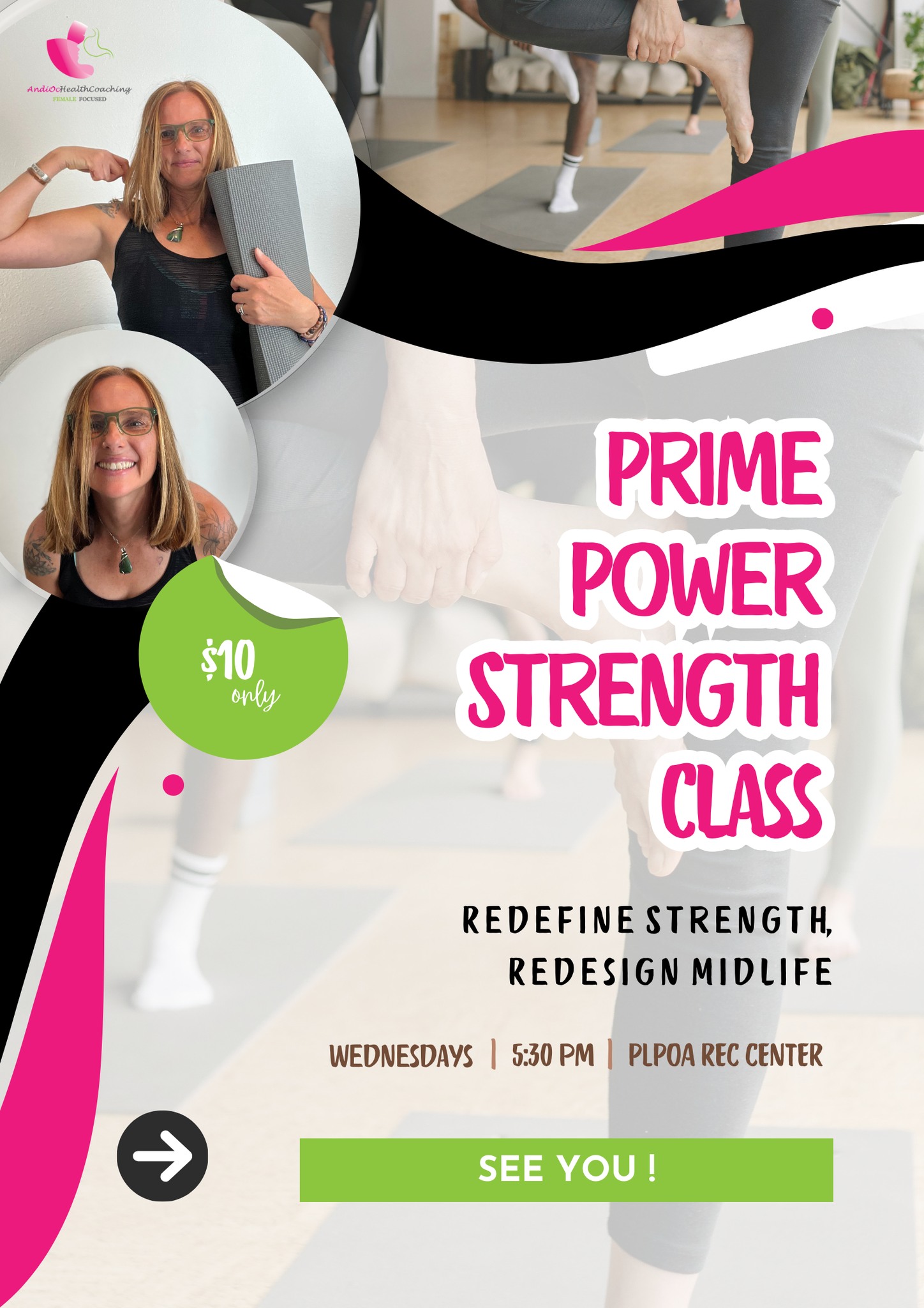 Redefine Strength. Redesign Midlife. Wednesdays 5:30-6:30pm at the PLPOA rec center. $10 + rec center pass. PrimePower Strength is a full-body, beginner-friendly